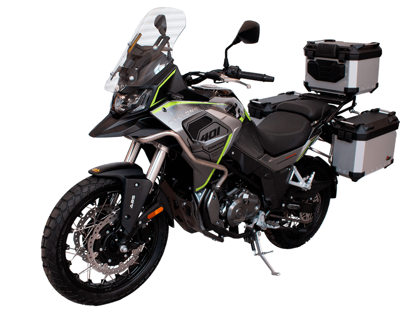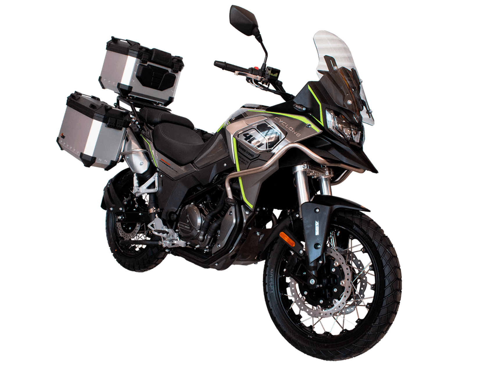 Мотоцикл CYCLONE RX401 (SR400GY-2D) – туристический эндуро, готовый бросить вызов любым дорогам и расстояниям. За рулём этого мотоцикла для вас не будет невозможных маршрутов. Его агрессивный дизайн всецело соответствует традициям жанра данного класса мототехники.Рядный двухцилиндровый четырёхтактный двигатель объёмом 401 см3 выдаёт 43 л.с. на 9500 об/мин. Максимальный крутящий момент достигается на 8000 об/мин и составляет 37 Н·м. Инжекторный впрыск топлива с блоком управления BOSCH увеличивает топливную экономичность, а также позволяет добиться высокой приёмистости и неприхотливости агрегата. Жидкостная система охлаждения не допустит перегрева двигателя даже при самом агрессивном вождении. На мотоцикл 6-ступенчатая механическая коробка передач.Максимальная скорость мотоцикла составляет 139 км/ч.RX401 оснащён спицованными алюминиевыми колёсами диаметром 17 и 19 дюймов. Колёса обуты в бескамерные покрышки от фирмы CST. С неровностями дороги эффективно справляются телескопическая вилка перевёрнутого типа спереди и маятник с моноамортизатором сзади. Ход передней подвески составляет 130 мм, задней – 55 мм. Оба компонента подвески являются регулируемыми. Эффективное и безопасное замедление с любых скоростей обеспечивают гидравлические дисковые тормоза с двухканальной системой ABS спереди и сзади.Клиренс мотоцикла составляет 185 мм. Объём топливного бака – 20 л. Снаряжённая масса – 215 кг.Мотоцикл отличает хорошо продуманная компоновка с высоко расположенным радиатором. На данной модели штатно установлены дуги безопасности, защита картера и двигателя, а также багажник с креплениями для боковых кофров. Кроме того, мотоцикл снабжён центральной подножкой для лёгкого обслуживания цепи, колес и вилки.Бортовой компьютер оборудован цветным дисплеем привлекательного дизайна со специальным защитным козырьком, спасающим от брызг и бликов. Из других приятных мелочей в допоборудовании мотоцикла стоит выделить 12-вольтовую розетку, подсветку пультов и USB-порт.Мотоцикл сочетает в себе отличные технические характеристики, комфорт и надёжность, что позволяет вам ощутить настоящую свободу на любой дороге с любым покрытием.