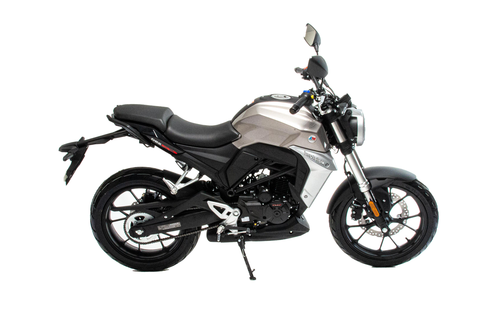 Мотоцикл Motoland CB250 (172FMM-5/PR250) (2022 г.) - новинка 2022 года. Дорожный мотоцикл (стритбайк) MotoLand CB250.CB250 является стильным, ярким и в то же время доступным мотоциклом. Современный облик подчеркивается последними решениями от лидеров мирового мотостроения: светодиодная оптика, дизайн пластика, харатеристики подвески, глушитель, расположенный под рамой.Данную модель выделяет покладистый характер, выверенная посадка, отточенная управляемость в городе и на трассе. Комфортное седло подходит для райдеров среднего роста.СВ250 оснащен двигателем 172 FMM (172FMM-5/PR250) с балансирным валом и 5-ступенчатой коробкой передач, мощностью 21 лс, с воздушно-масляным охлаждением, кикстартером / электростартером. На двигателе установлен карбюратор Keihin PZ 30.Также на новинке установлены усиленные двухпоршневые передние тормоза, литые алюминиевые обода, передняя вилка перевёрнутого типа с большим ходом, которая обеспечивает отличную управляемось для комфортного передвижения, как по городу, так и по бездорожью.Усиленная 520 цепь в сочетании с хорошо подобранными звездами, обеспечивает отличную динамику.Качественные покрышки на 17" ободах, 110/70 и 140/70, обеспечивают отличное сцепление с дорожным покрытием. Рама дуплексная, профилированная, усиленная ребрами жесткости. Удобное мягкое сиденье и жидкокристаллическая цветная панель приборов с подсветкой - порадуют комфортом и удобством.