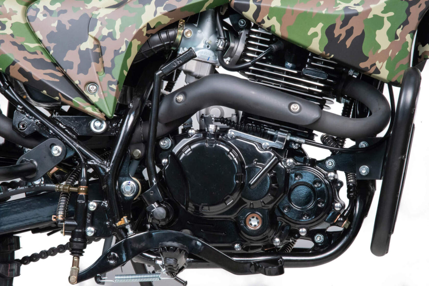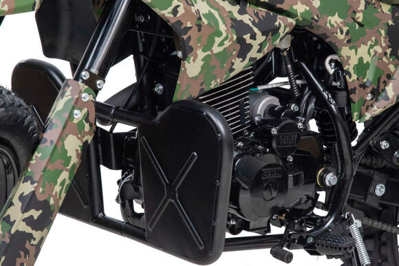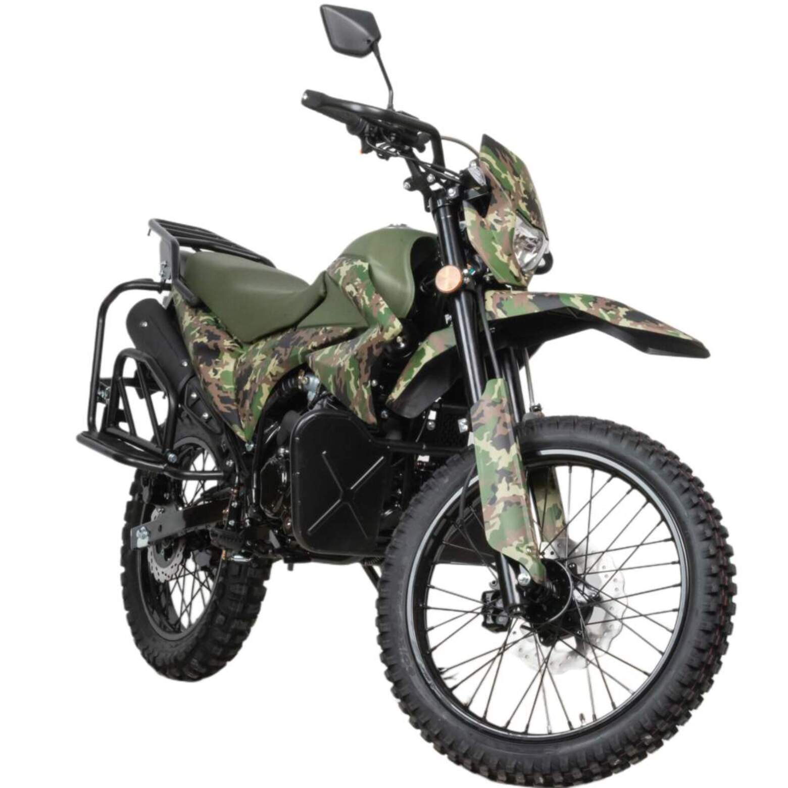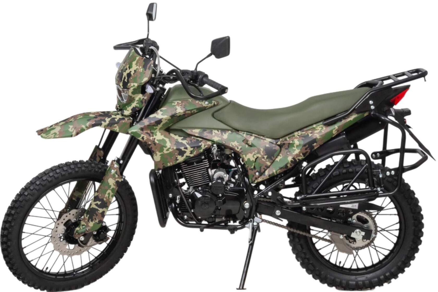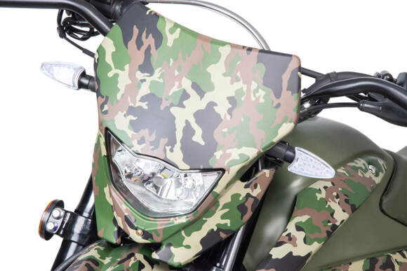 Камуфляжная расцветка подчеркивает брутальный характер мотоцикла, делая его не только функциональным, но и стильным. Это техника, которая выделяется на фоне других и говорит о вашем бесстрашии.