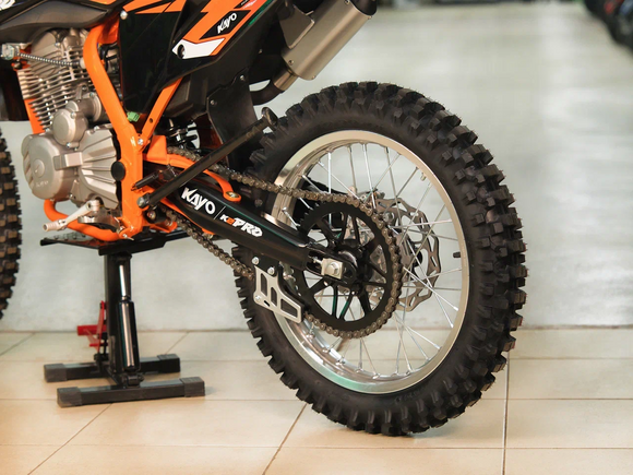 Кроссовый мотоцикл KAYO K2 Pro – идеальный снаряд для внедорожного экстрима, представляющий собой оптимальный баланс производительности и технической оснащённости, поэтому он идеально подходит как новичкам, так и опытным райдерам. Он является улучшенной версией “народного” мотоцикла KAYO K1. Удобный, простой и надёжный мотоцикл, который полностью оправдывает свою цену.Мотоцикл оснащён одноцилиндровым 4-тактным двигателем воздушного охлаждения (ZONGSHEN CB300/ZS175FMM) объёмом 271 см3, который обеспечивает высокую мощность (24 л.с.) и крутящий момент, что позволяет развивать большую скорость и с лёгкостью преодолевать трассы со сложным рельефом. Карбюратор NIBBI PE30 обеспечивает бесперебойную работу техники в самых жестких условиях эксплуатации, простоту и лёгкость в обслуживании, а также неприхотливость к качеству топлива. Аппарат оснащён 5-ступенчатой механической коробкой передач с классической схемой “1-N-2-3-4-5”.Усиленная рама из хром-молибденового сплава и подвеска позволяют эффективно амортизировать удары при езде по неровностям и препятствиям на трассе. Передняя подвеска — регулируемая телескопическая вилка перевёрнутого типа от фирмы KKE длиной 800 мм, задняя — регулируемый моноамортизатор 420 мм с прогрессией, рассчитанный на высокие нагрузки, также произведённый компанией KKE. Мотоцикл оснащён классическими спицованными колёсами диаметром 18 и 21 дюйм. Эффективное и безопасное замедление с любых скоростей обеспечивают гидравлические дисковые тормоза.Мотоцикл достаточно компактен, поэтому он комфортен в эксплуатации одновременно и для мужчин среднего телосложения, и для девушек. Байк оснащён системой запуска двигателя при помощи кнопки электростартера или при помощи рычага кик-стартера.Высококачественная износостойкая резина с развитым протектором отлично держит дорогу на различных типах покрытия и в самых разных поворотах. Сиденье эргономичной формы покрыто антискользящим материалом.K2 Pro сочетает в себе отличные технические характеристики, комфорт и надёжность, что позволяет вам ощутить настоящую свободу на любой трассе.