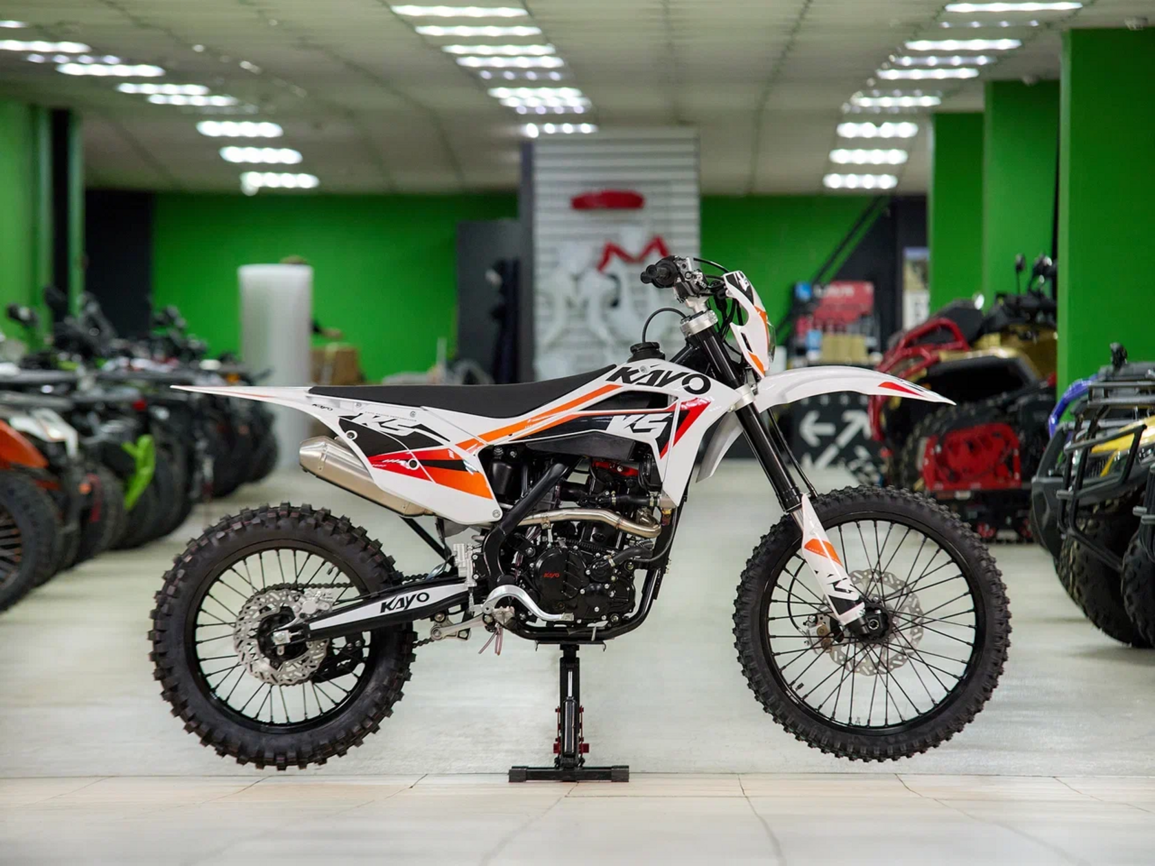 Кроссовый мотоцикл KAYO K5 Enduro – идеальный снаряд для внедорожного экстрима, представляющий собой оптимальный баланс производительности и технической оснащённости, поэтому он идеально подходит как новичкам, так и опытным райдерам. Удобный, простой и надёжный мотоцикл, который полностью оправдывает свою цену.Мотоцикл оснащён одноцилиндровым 4-тактным двигателем (ZONGSHEN NB300/ZS174MN-5) с балансирным валом и объёмом 280 см3, который обеспечивает высокую мощность (27 л.с.) и крутящий момент, что позволяет развивать большую скорость и с лёгкостью преодолевать трассы со сложным рельефом. Карбюратор NIBBI PWK34 обеспечивает бесперебойную работу техники в самых жестких условиях эксплуатации, простоту и лёгкость в обслуживании, а также неприхотливость к качеству топлива. Жидкостная система охлаждения не допустит перегрева мотора даже при самом агрессивном вождении. Аппарат оснащён 6-ступенчатой механической коробкой передач с классической схемой “1-N-2-3-4-5-6”.Усиленная рама из хром-молибденового сплава разработана фирмой KAYO. Передняя подвеска — регулируемая телескопическая вилка перевёрнутого типа длиной 880 мм, задняя — регулируемый моноамортизатор 470 мм с прогрессией, рассчитанный на высокие нагрузки. Оба компонента подвески произведены фирмой KKE. В паре они позволяют эффективно амортизировать удары при езде по неровностям и препятствиям на трассе. Мотоцикл оснащён классическими спицованными колёсами диаметром 18 и 21 дюйм. Эффективное и безопасное замедление с любых скоростей обеспечивают гидравлические дисковые тормоза.Мотоцикл достаточно компактен, поэтому он комфортен в эксплуатации одновременно и для мужчин среднего телосложения, и для девушек. Байк оснащён системой запуска двигателя при помощи кнопки электростартера или при помощи рычага кик-стартера.Высококачественная износостойкая резина с развитым протектором отлично держит дорогу на различных типах покрытия и в самых разных поворотах. Сиденье эргономичной формы покрыто антискользящим материалом. Данная модель укомплектована очень яркой фарой со светодиодным модулем, которая позволяет кататься и в ночное время.K5 Enduro сочетает в себе отличные технические характеристики, комфорт и надёжность, что позволяет вам ощутить настоящую свободу на любой трассе.