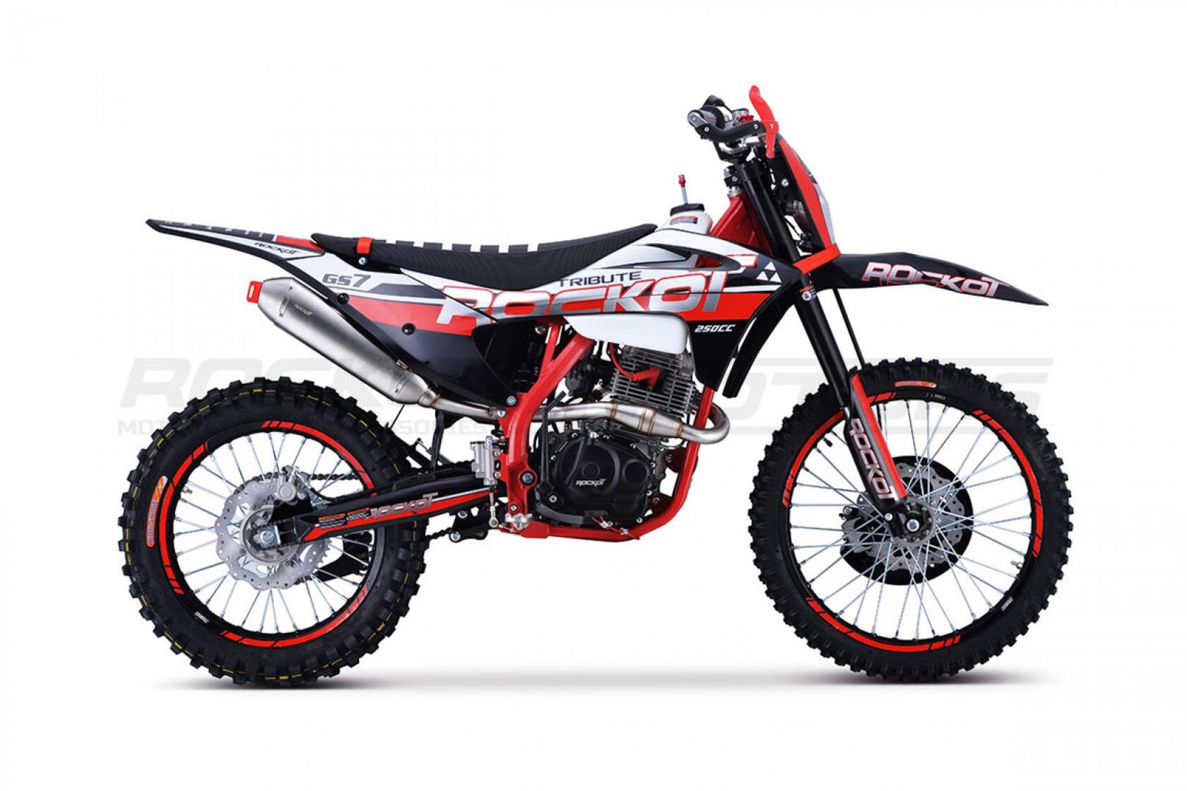 Rockot GS 7 Tribute - среднеразмерный эндуро мотоцикл нового поколения. Ранее, все внимание производителей эндуро мотоциклов, было приковано к моделям полноразмерной компоновки. Компания Rockot-Motors и модель GS 7 Tribute, в корне меняет представление о среднеразмерных эндуро. GS 7 Tribute оснащаются лучшими комплектующими, как и более старшие модели полноразмерных мотоциклов.Ранее, мотоциклы средней базы, могли рассматриваться только лишь в качестве “эндуро выходного дня”. Новая же модель, способна преодолеть все трудности рельефа профессиональных эндуро трасс.На эксклюзивность дизайна GS 7 Tribute, указывает применение в модели пластика “GASGAS 21”, который ранее не устанавливался на среднеразмерные мотоциклыВ стилистике “GASGAS” выполнен логотип “ROCKOT” в серебристом цвете, который украшает левую и правую боковину мотоцикла. Потрясающая графика на пластике, не оставит вас равнодушными. Еще, одна отличительная особенность дизайна - уже привычная многим, фара “КТМ”. Законченный вид мотоциклу, придает большое обилие тюнинга, которое прямо говорит о его предназначении к серьезному эндуро.