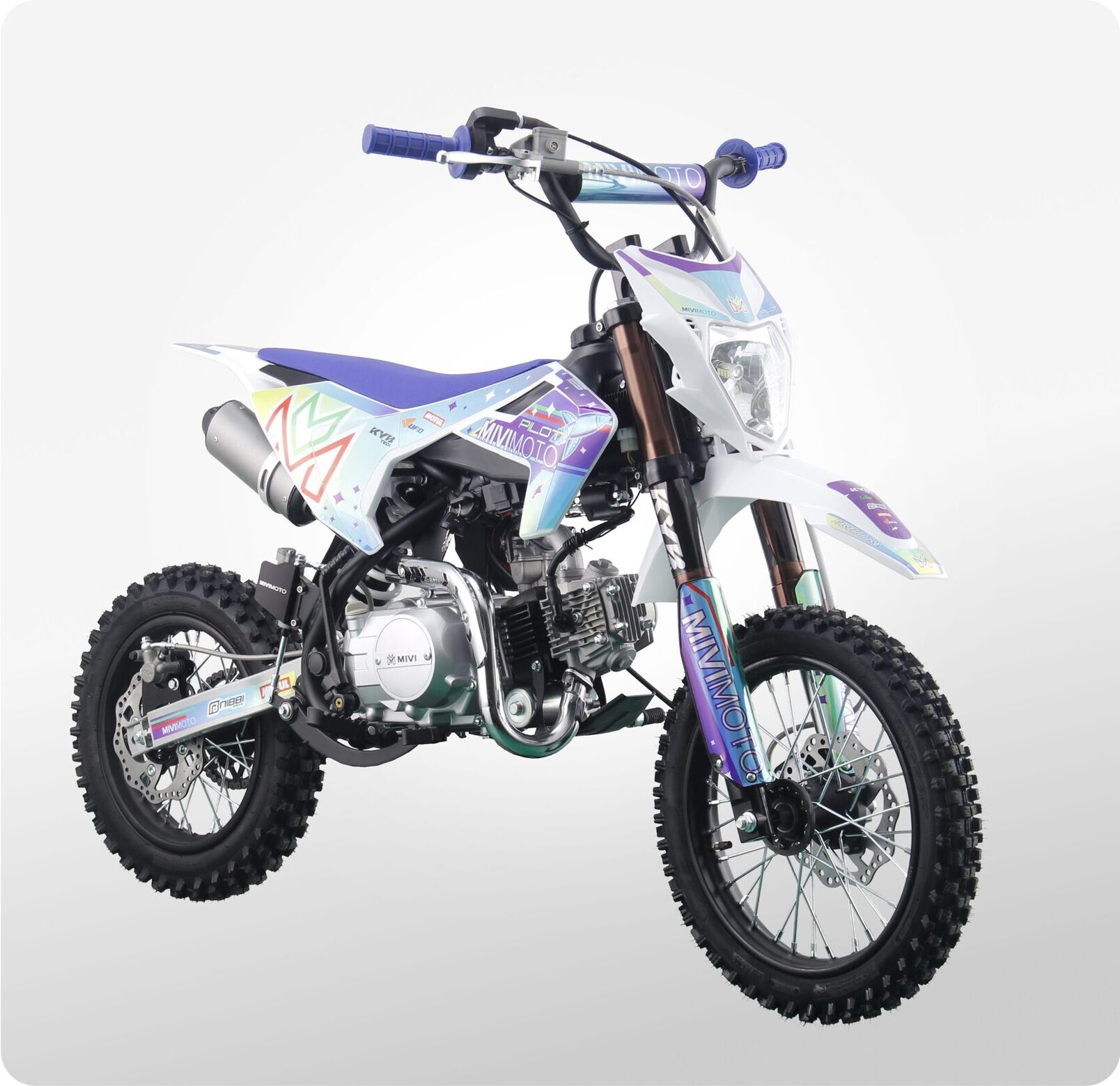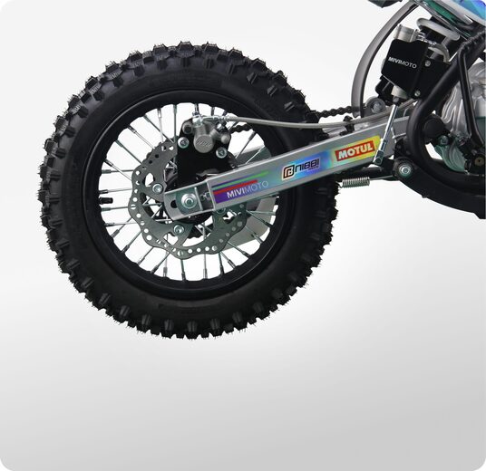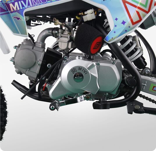 MIVIMOTO PILOT 125 — идеальный питбайк для новичков и молодых гонщиков. Легкий, компактный и надежный, он создан для тех, кто делает первые шаги на трассе и стремится развивать свои навыки. Модель сочетает в себе продуманный дизайн, простоту управления и уверенную динамику.- Четырехтактный одноцилиндровый двигатель объемом 125 см³ / 8 л.с. с воздушным охлаждением в сочетании с карбюратором Nibbi Racing PE17 обеспечивает эффективную подачу топлива и стабильную работу в любых условиях. Двигатель оснащен электростартером и полуавтоматической трансмиссией. Все это позволяет управлять техникой даже самым юным любителям мотоциклов.- Спереди питбайк оснащен перевернутой телескопической вилкой KYB tech, сзади — моноамортизатором с регулируемой жесткостью. Конфигурация обеспечивает плавный ход, хорошую отработку неровностей и комфорт при прыжках и резких маневрах.